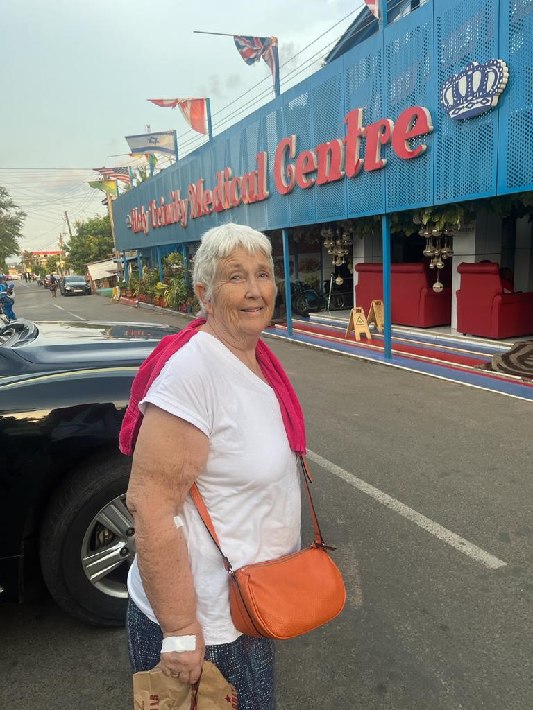 Tuesday. Mary wakes up with a pain in her chest. So it’s a frantic drive to Holy Trinity Hospital Kaneshie. Blasting our horn the traffic parts in front of us. When we turn up at the hospital a nurse comes out immediately to take Mary in a wheelchair for a consultation. Then it’s upstairs to a private room in this beautiful Christian hospital. The staff are lovely and as we wait for test results we sit in this lovely room looking out over Accra. There are waving plantain, palm and cocoa palm trees. The sky is African blue. Eventually we are given the all clear and I asked Mary how she felt. She replied – ”Lovely!”